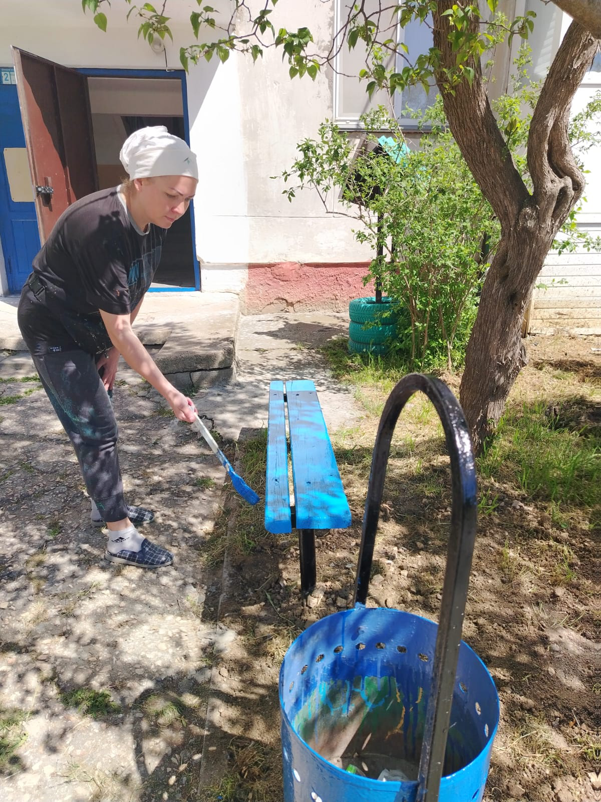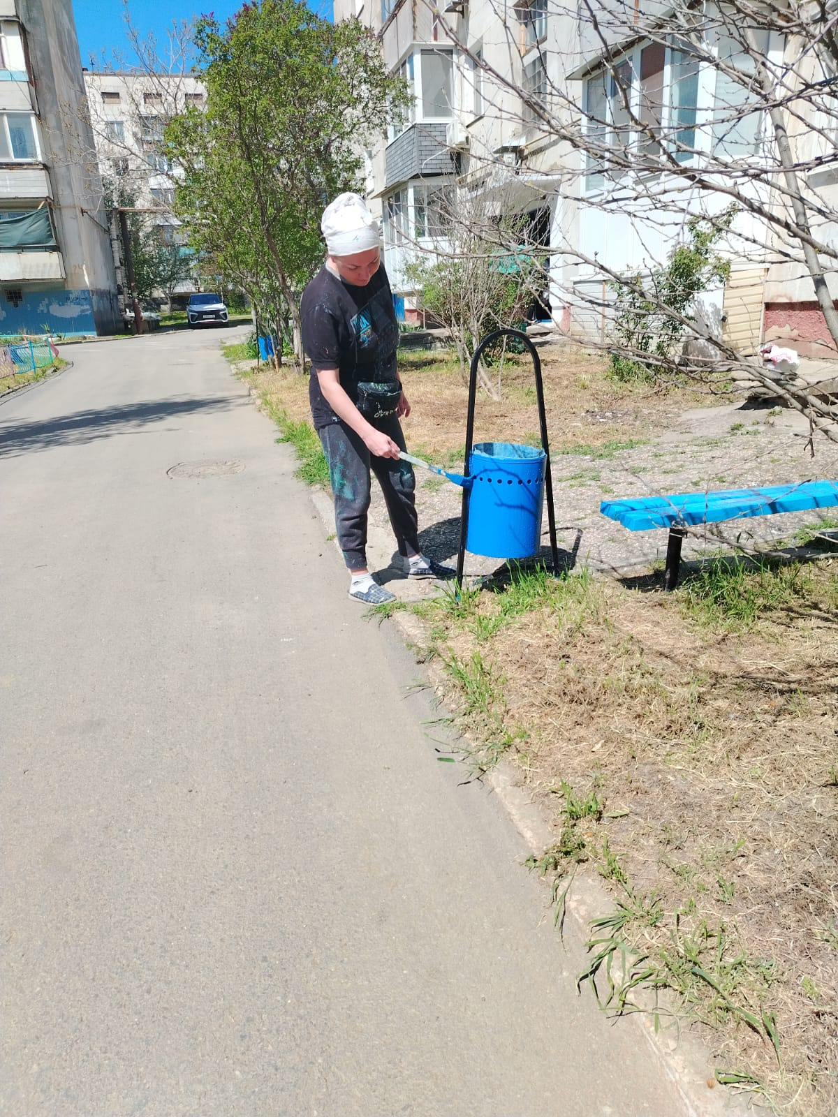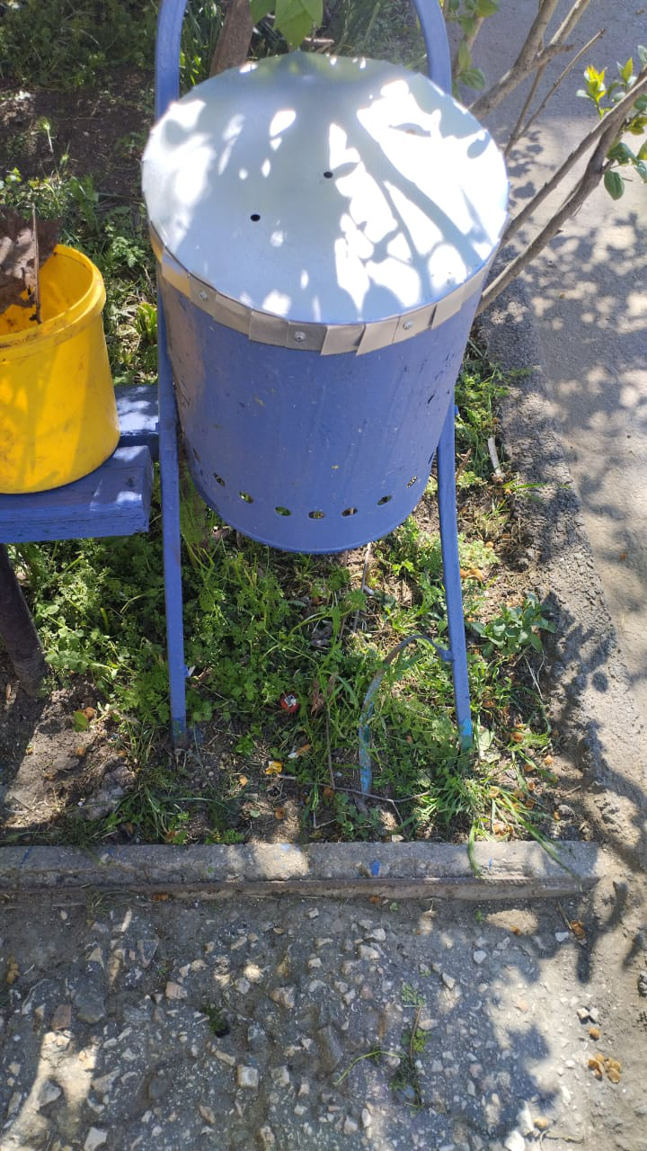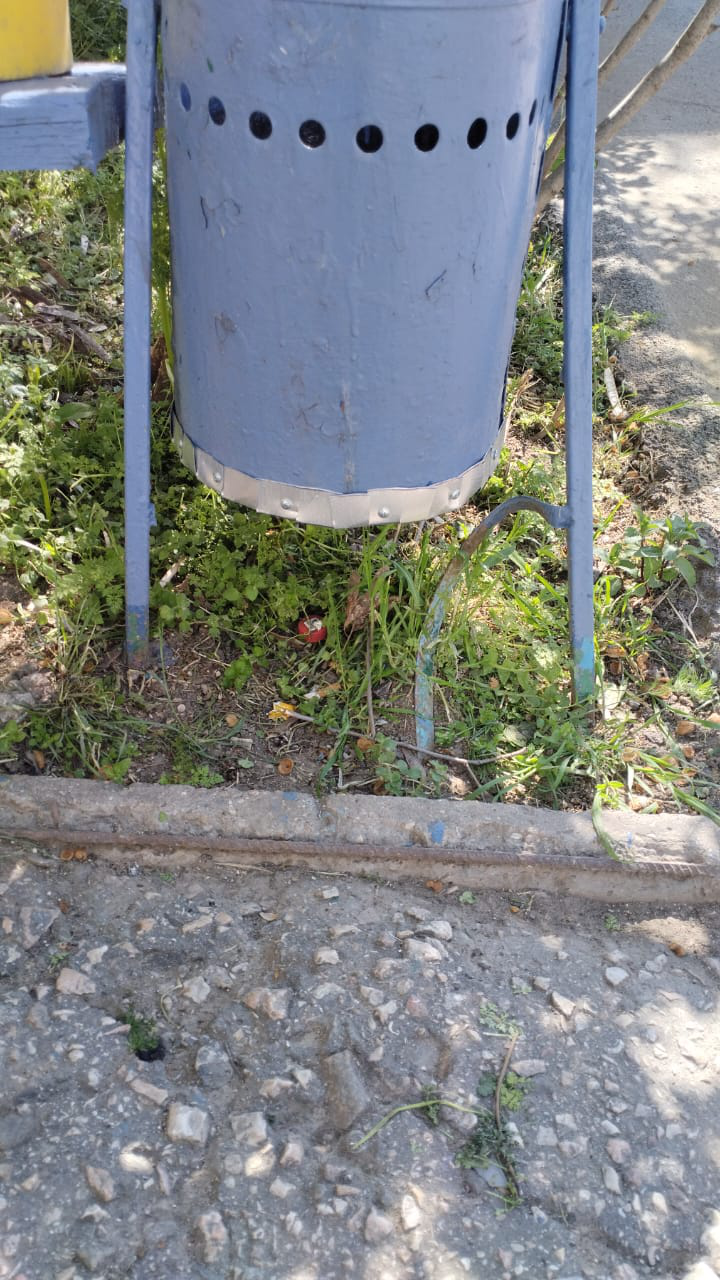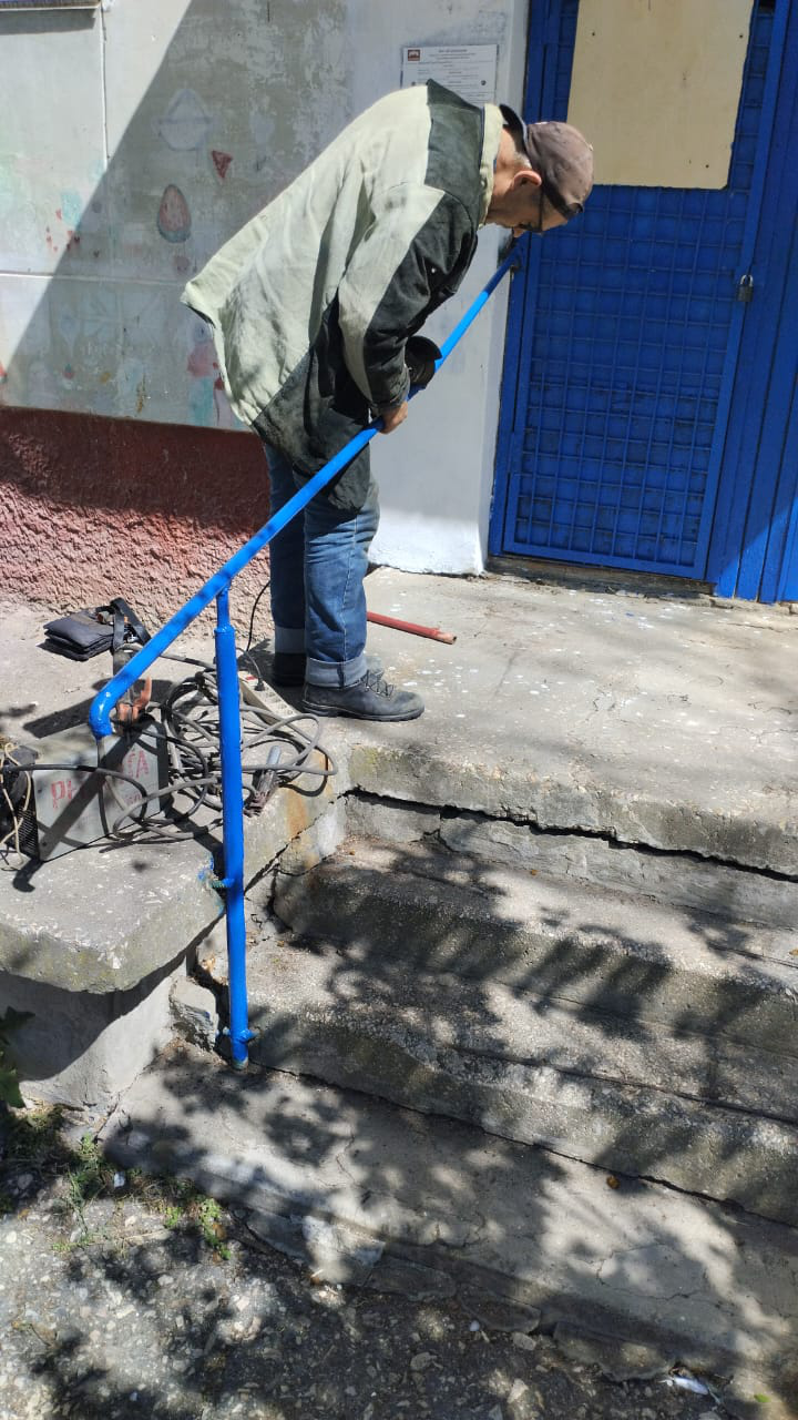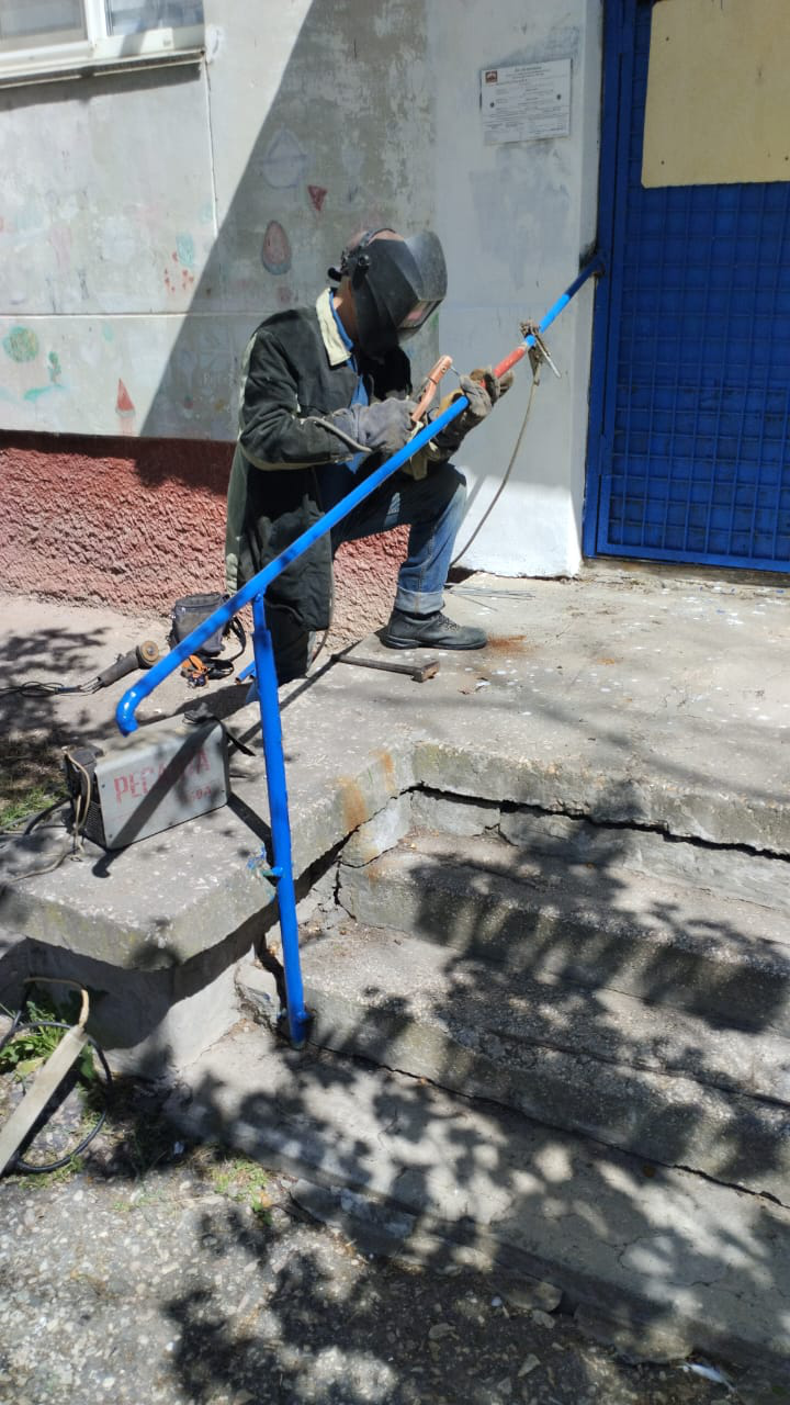Буденного, 22 работы по благоустройству: ремонт урн, покраска лавочки и урн, ремонт ограждения детской площадки (сварка), ремонт поручня в подъезде 5 (сварка)